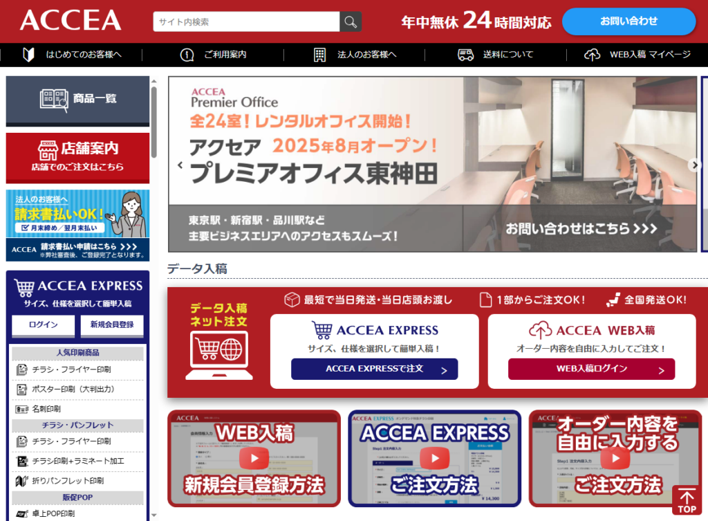- 入稿方法: Illustrator/Photoshop/PDFのほか、Officeデータ(PowerPoint等)も入稿可。オンライン注文画面で入稿・校正確認可能