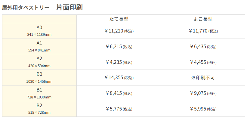 - 最小ロット価格: タペストリー1枚 ¥2,980~(税抜¥2,709~、B2縦・プラパイプの場合)