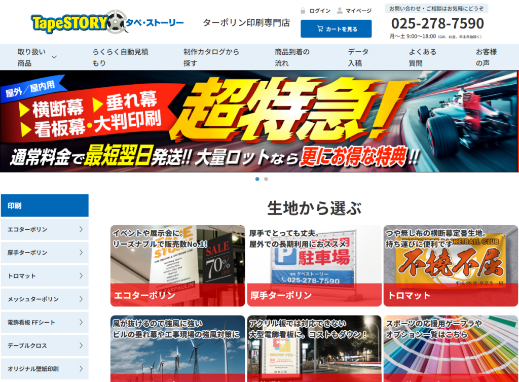 TAPESTORY(タペストーリー)はターポリン生地の横断幕・タペストリー専門店で、短納期かつ高品質な出力に定評があります。生地はターポリンでもエコターポリンから厚手、防炎タイプまでそろえ、他にもトロマット布やメッシュ素材など用途に応じた豊富な素材を用意しています。自社工場生産で納期厳守し、特急料金のオプションで当日出荷にも対応可能。デザイン料・送料・代引手数料まですべてコミコミ価格なのも安心ポイントです。印刷の仕上がりにもこだわっており、商品と一緒にミニチュアサイズのおまけ幕を同梱するユニークなサービスもあります(実物と同素材の縮小版で、色味や質感を事前確認できると好評)。梱包はタペストリーを丁寧に丸めて専用箱で発送するため、シワにならず届きます。業務用クラスの高品質を求める方におすすめの専門サービスです。