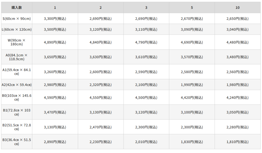 「できるだけ低コストで作りたい」方向けに、1枚あたりの料金が安いサービスを中心に紹介します。B3サイズ程度のタペストリーでの価格を比較すると、最安クラスでは1枚¥1,000前後から制作可能です(※大きさや素材によって価格は変動します)。複数枚まとめて注文すれば1枚あたりの単価がさらに下がるサービスもあるので、予算重視の方は要チェックです。