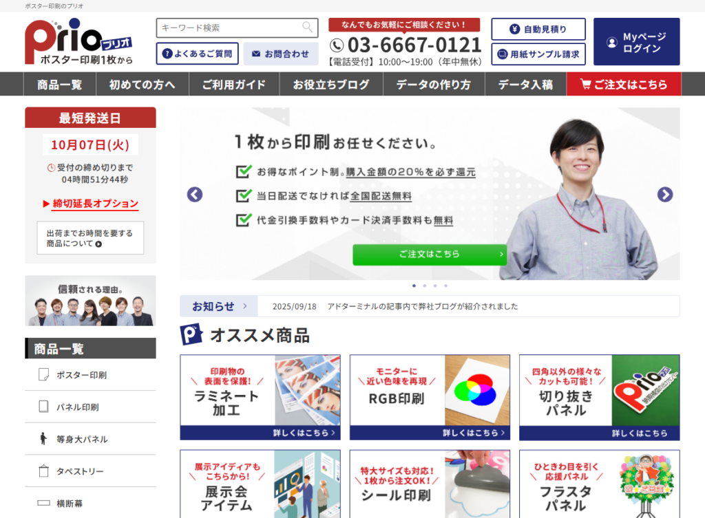 プリオは口コミ数3万件超えの人気大型出力センターで、大判印刷の専門店として品質・サービスとも高い評価を得ています。タペストリーは10種類もの素材から選択可能で、光沢紙や布ポスター、メッシュターポリンなど多彩なラインナップ。用途に応じて最適な素材・仕上げを提案してもらえるため、仕上がりにこだわりたい人にぴったりです。特に写真やイラストを美しく表現するフォト画質の印刷や、カット精度の高い仕上げに定評があります。注文は24時間対応で、年中無休・10~19時のサポート体制も心強いです。また最短当日発送にも対応(当日仕上げコース利用時)し、通常発送でも翌日到着なら送料無料というサービスも展開しています。運営元の株式会社オーレは大判印刷専門企業で信頼性も抜群。大切な作品を高品質に仕上げたい方におすすめできるサービスです。