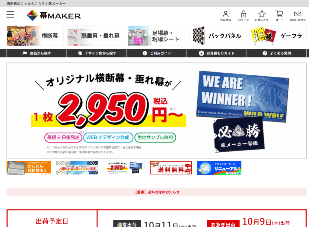 | 幕メーカー(㈱大阪美装) | 1枚¥990~ | 最短2営業日後発送 | ¥1,430(¥11,000以上割引) | サイズ豊富・用途多彩 |