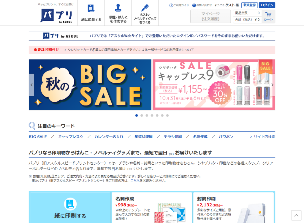 | パプリ(アスクル㈱) | 1枚¥3,333~ | 最短6営業日後着 | ¥0(¥2,000以上) | 一般向け・送料無料 |